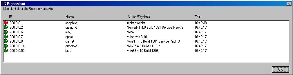 | Grün: | Der Zielrechner wurde erfolgreich kontaktiert und hat eine Antwort zurückgesendet. Die Antwort wird in der Spalte Aktion/Ergebnis angezeigt. |
